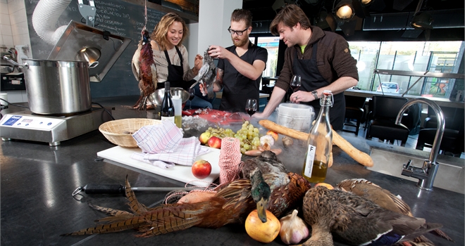 Culinaire Werkplaats MESS organiseert samen met Chef Marnix Benschop ( Ivy, Fat Duck, NOMA, de Matroos en het Meisje), jager Harmen Jan de Graaf, Sommelier Unico Wilkens (Bergse Cave) een uniek culinair workshopprogramma over wild en wijn in de moderne keuken. Je krijgt alle kans de geheimen van het wildseizoen te ontrafelen door er zelf mee aan de slag te gaan. Er is een uitgebreide uitleg over de jacht, seizoenen en natuurbeheer en je leert wijn-spijs-combinaties maken tijdens de proefsessie met onze Sommelier. Wat zijn de chemische processen waar je rekening mee moet houden bij het besterven en bereiden van het vlees? Ga zelf aan de slag met het villen van diverse soorten wild dat speciaal is geschoten op de Veluwe. Onder begeleiding van onze chefs werk je met de modernste apparatuur en technieken: sous-vide vlees garen, geleren en ijs maken met vloeibaar stikstof. Daarnaast is er ruim baan voor klassiekers als stoven en het bereiden van sauzen Het resultaat wordt een gastronomisch 6-gangen wilddiner waaraan iedereen meewerkt én ervan kan genieten. Reserveer vooraf via